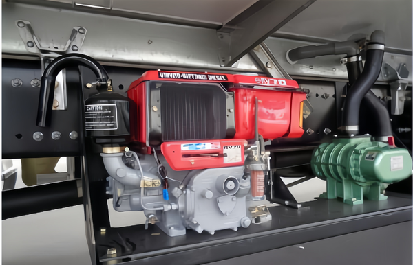 Cấu tạo chính: Máy thổi khí (Roots blower hoặc loại cánh quạt được thiết kế đặc biệt) đặt gọn gàng trên xe, kết nối với bình chứa hoặc máng nước chứa tôm.